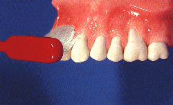 Se aplica el cepillo de dureza media o blando con un ángulo de 45° en relación con el eje del diente, aplicando una ligera presión sobre la encía. Las cerdas del cepillo se doblan y el cepillo se dirige hacia abajo, girando ligeramente el mango.